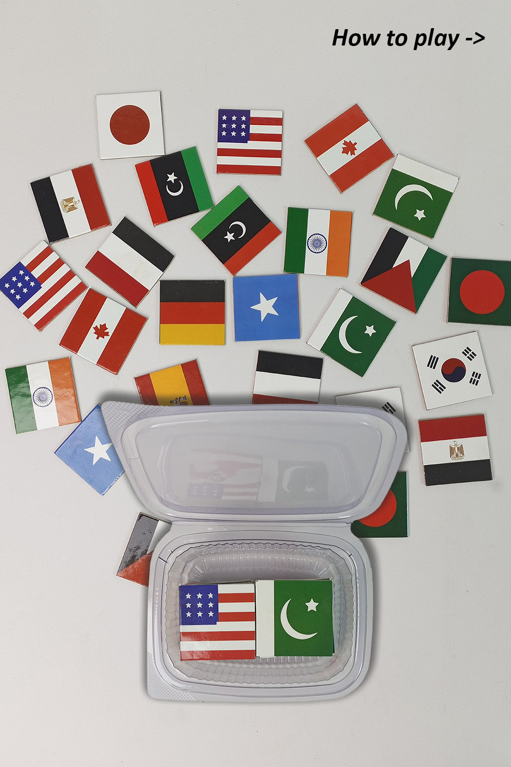 Step 2: player 1 should now flip 2 pieces and if find matching flags then player 1 keeps the set, incase if both flags don't match then again turn them back and ask player 2 to start his/her turn